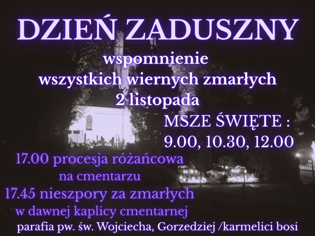 aktualności klasztoru Gorzędziej wróć 2 listopada, wspomnienie wszystkich Wiernych Zmarłych 2 listopada, 2025 podziel siępodobne posty Aktualności VIII gorzędziejski MARSZ ŚWIĘTYCH 28 października, 2025 JUŻ W PIĄTEK!!! VIII gorzędziejski… Aktualności VIII gorzędziejski MARSZ ŚWIĘTYCH 28 października, 2025 JUŻ W PIĄTEK!!! VIII gorzędziejski… Aktualności RÓŻANIEC KOBIET 6 października, 2025 Projekt „KBS” – „Kobieta Bogiem… Aktualności RÓŻANIEC KOBIET 6 października, 2025 Projekt „KBS” – „Kobieta Bogiem… Aktualności Święto Teresy od Dzieciątka Jezus 21 września, 2025 W środę, 1 października, obchodzimy… Aktualności Święto Teresy od Dzieciątka Jezus 21 września, 2025 W środę, 1 października, obchodzimy…